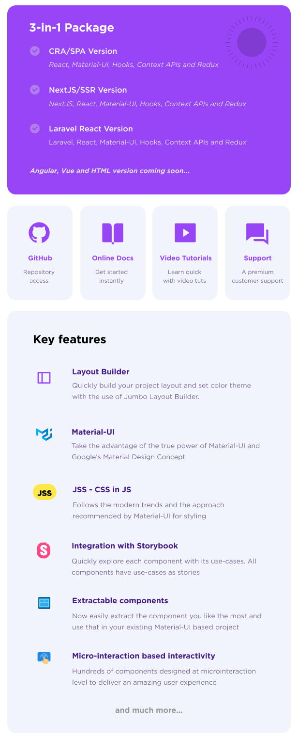 Jumbo React包括超过 300 个用户界面组件、超过 150 个小部件和指标、超过 25 个完整级别的 PSD 以及超过 130 个设计页面。