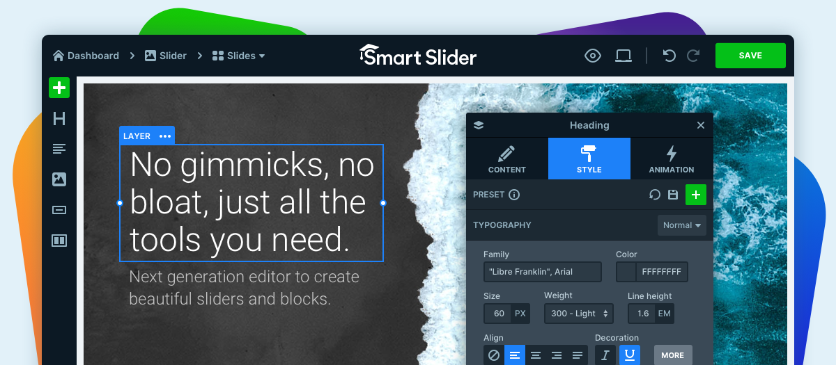 用户友好的编辑器- 任何人都可以使用智能滑块进行构建。该界面带有拖放构建器和实时预览。