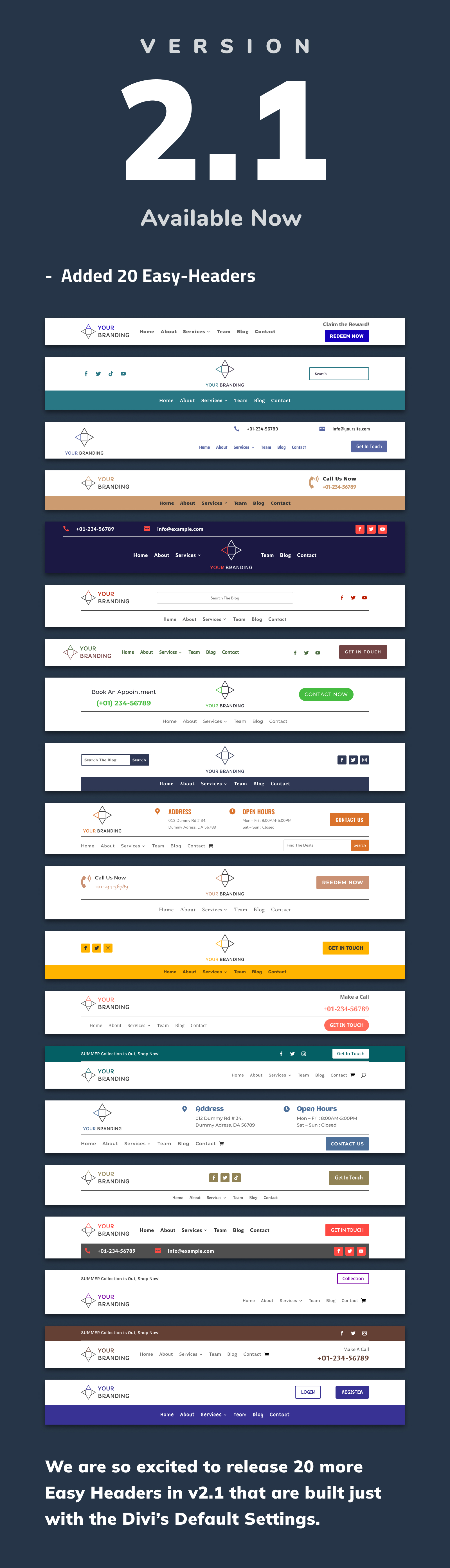 该产品带有 940 多个现代和创意页眉布局,其中 20 个 Easy-Headers 仅使用 Divi 的默认设置构建。自由职业者的完美组合。您可以选择任何布局并对其进行自定义以与您或您客户的网站一起使用。