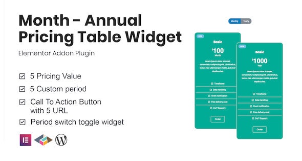 Month – Elementor的年度定价表小部件 是Elementor的插件,提供定价表和切换期按钮小部件。您可以使用五个基于不同期间的价格值来构建价格表。