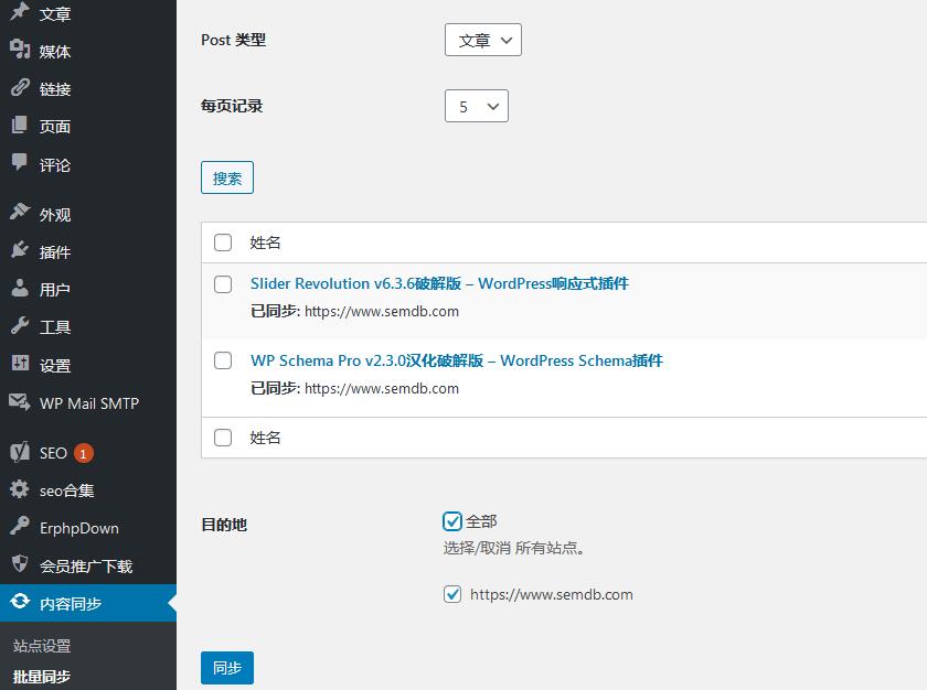 第五步:批量同步,按我下面这样设置,看你每次需要同步多少文章,选择好之后,先点搜索,然后,勾选你要同步的目的地,最后点同步,数据一会就同步过去了。