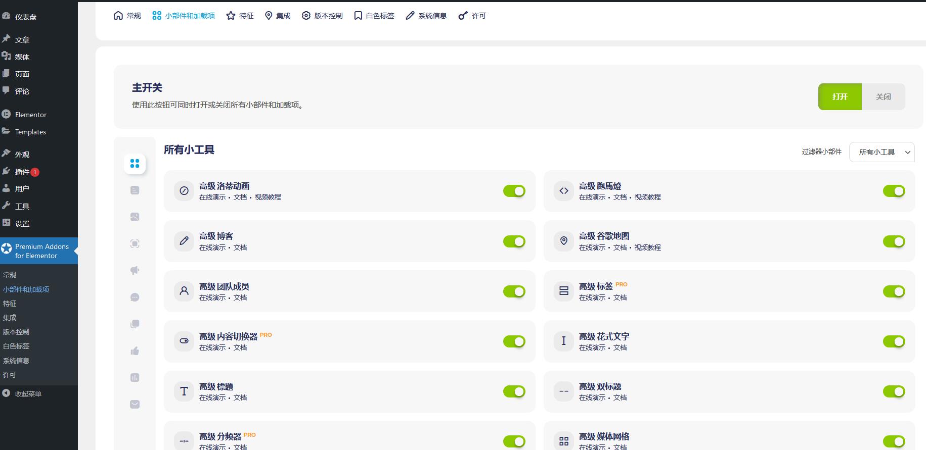 1、下载premium-addons-pro和premium-addons-for-elementor并安装,根据提示安装elementor,启用这三个插件。