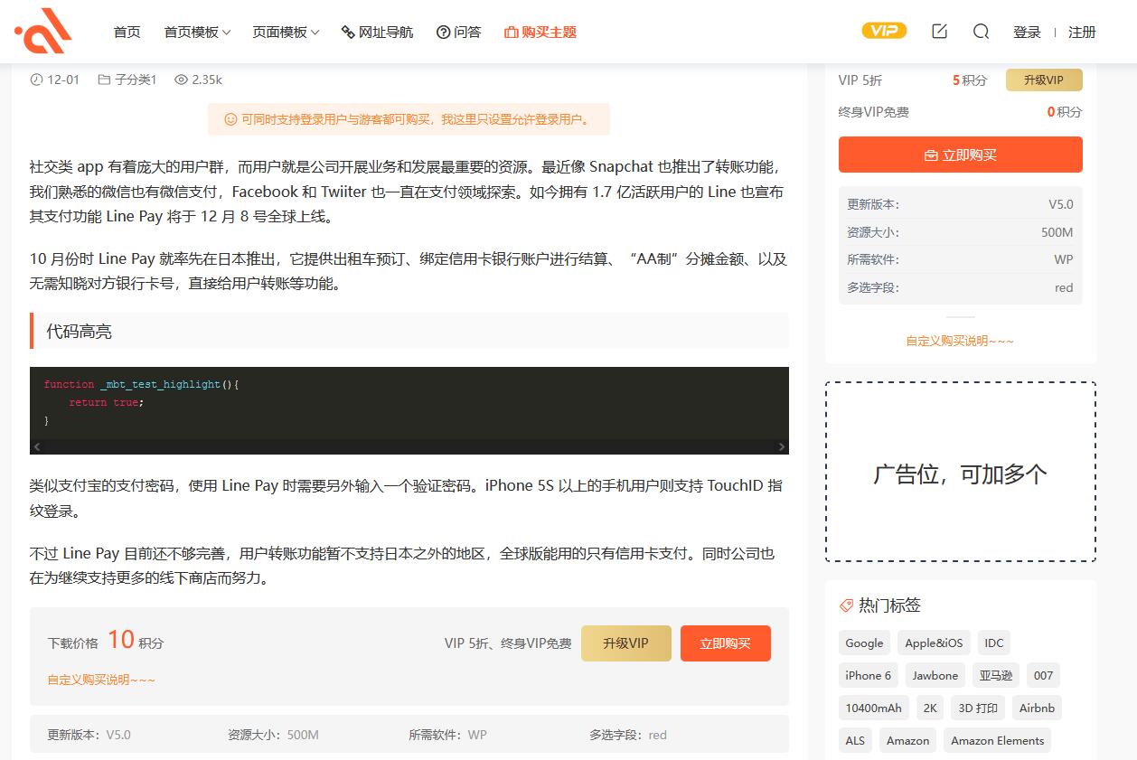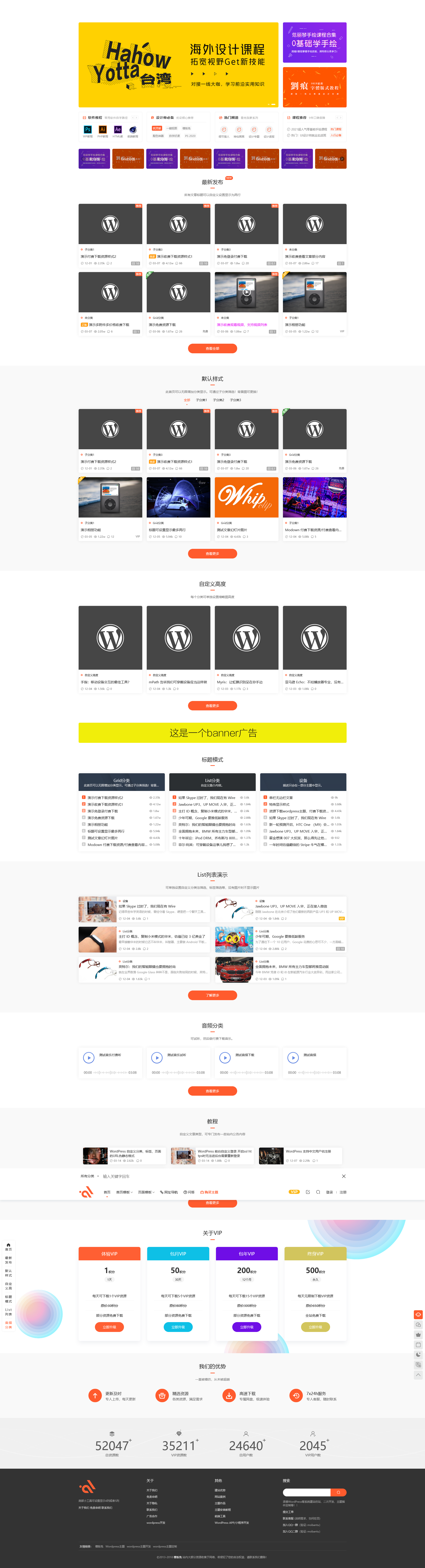 自适应响应式设计,兼容主流浏览器 网格样式与瀑布流样式任意切换 内置SEO优化 自带与主题UI完美兼容搭配的erphpdown前端用户中心页面(此功能若单独找我们定制也需要几百) 收费付费下载资源、付费查看内容、付费观看视频、付费下载音乐,上传文件支持第三方云存储(OSS、七牛云等插件) VIP权限下载与查看,VIP名称支持自定义 用户投稿上传资源售卖,赚取积分,可提现 用户推广系统(A推广B注册,B消费后A拿提成,可提现),可实现三级分销 每日签到送积分 在线工单 白天/夜间模式切换(后台可设置自动切换、默认夜间模式、禁止切换)、繁简体切换 相册功能增强:游客预览图片数、VIP权限浏览相册 多个首页模板选择,首页banner处可以换成幻灯片、增加搜索框、按钮等 分类多重筛选(分类最多4级筛选,每个分类的筛选标签可自定义、自动获取相关标签)、无限自定义分类法筛选 自定义文章类型(博客或教程等等),文章列表显示 列表样式切换网格Grid或者博客List,文章博客列表样式 一键社交账号登录(微信扫码登录、QQ登录、微博登录、关注公众号登录支持个人可申请的未认证的订阅号,关注公众号一键登录需安装插件,自定义的登录注册找回密码页面模板(含验证码),邀请码注册,手机号注册 多个小工具以及页面模板(前端投稿页面) CMS式首页模板(显示多个分类板块,可子分类筛选) Ajax无刷新处理多处请求 集成ckplayer视频播放器(使用短代码 【ckplayer】视频地址【ckplayer】)与DPlayer播放器 外链特色图片,列表页文章图片可自定义高度 视频缩略图预览(鼠标hover自动播放预览视频) 文章单栏与双栏切换,可点赞收藏 列表页可设置最大显示4列、5列、6列、小5列 手机端底部固定导航(可自定义) 简单适配Woocommerce 自带子主题