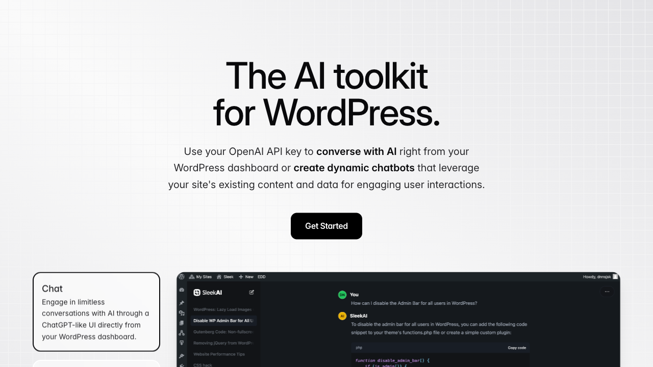 使用您的 OpenAI API 密钥在 WordPress 中的任何地方与 AI 对话,或创建动态聊天机器人,利用您网站的现有内容和数据来吸引用户互动。