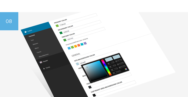 配色方案经理-只需单击一下即可更改整个网站的配色方案!在主题选项面板中,您将找到 6 种预定义的配色方案。此外,使用内置颜色选择器,您可以创建自己的配色方案或更改页面各个元素的颜色。
