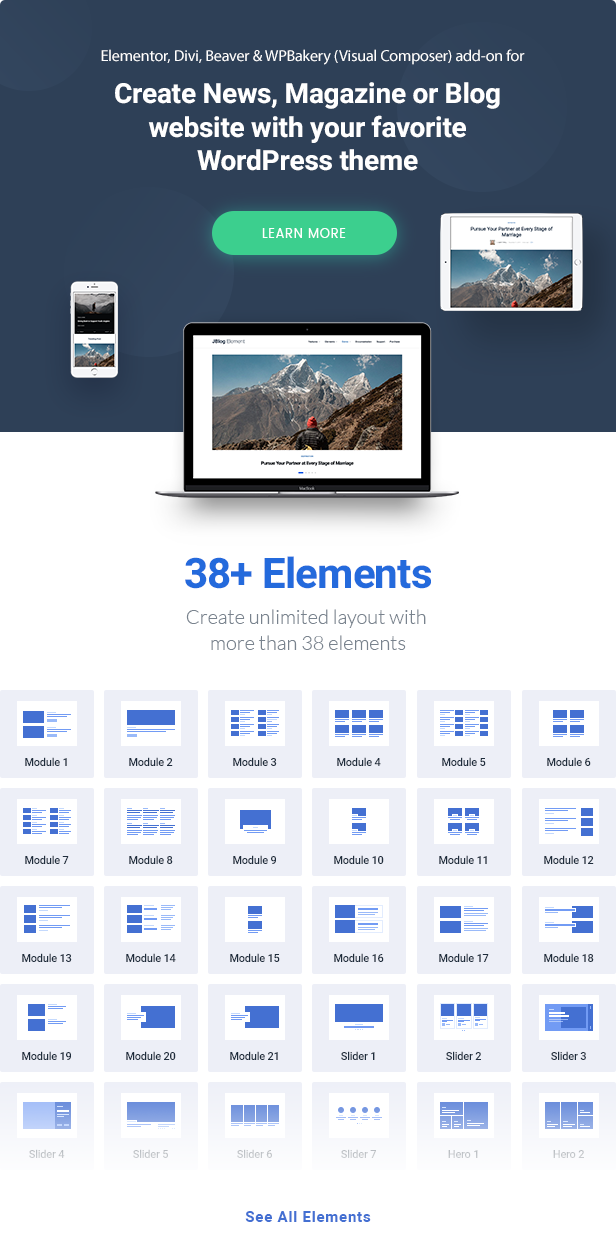 它也非常适合希望使用页面构建器功能设计布局的网站设计师。使用随时可用和可定制的元素提升您的网页设计流程。用超过 38 个元素组成布局,包括博客元素、滑块、英雄等等……