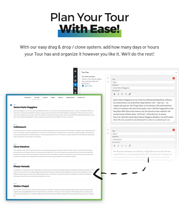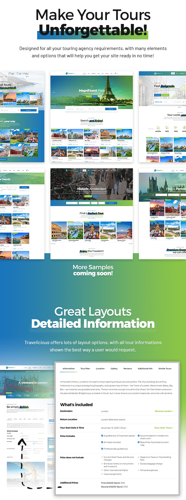 旅游详情:包括、不包括、目的地、嵌入式地图、画廊、旅游计划、评论、类似旅游等。