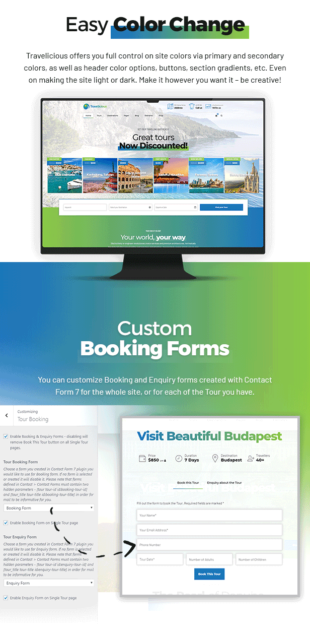 Travelicious 提供了全面的选项面板、独特的页面转换和独特的排版以及高度评价的可定制成本计算器插件,该插件随此主题免费提供。它还包括易于使用且快速的粗体页面构建器。