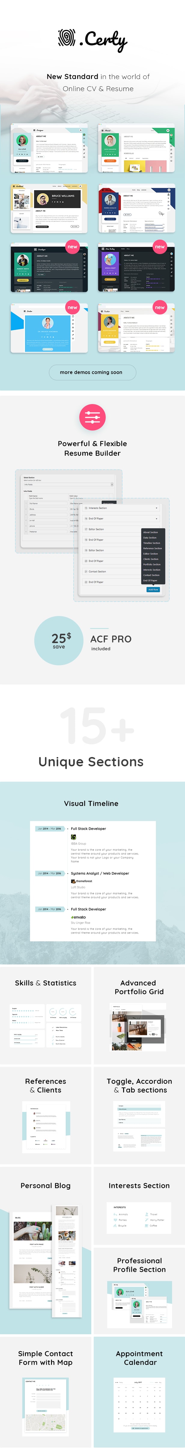Certy是在线简历世界的新标准。干净漂亮的有吸引力的材料设计将从第一印象中吸引您未来的雇主。SEO 友好、语义正确且有效的 w3 代码以及创新的移动设计将帮助您改进在线简历。灵活而强大的管理面板和独有的功能将帮助您通过 Certy 获得独特的创意。