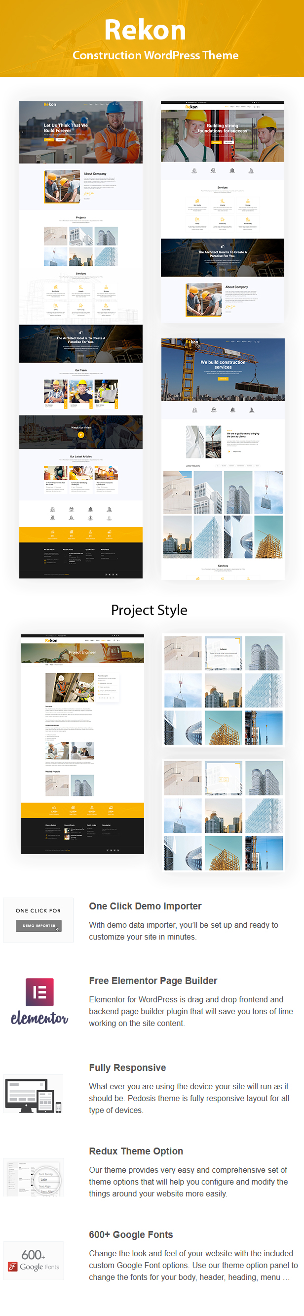 Rekon 是一个现代、独特且干净的响应式 WordPress 主题。它可能是建筑和建筑公司的完美选择,因为它提供了反映其业务性质的现代设计。任何尺寸的布局看起来都很漂亮,无论是笔记本电脑屏幕、iPad、iPhone、Android Mobile 还是平板电脑。