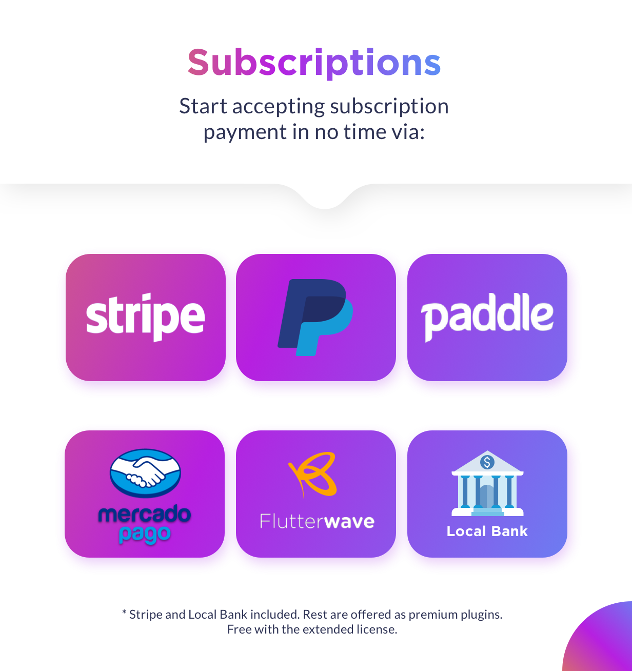 通过 Stripe、PayPal、Paddle、PayStact 和 Local 接受订阅