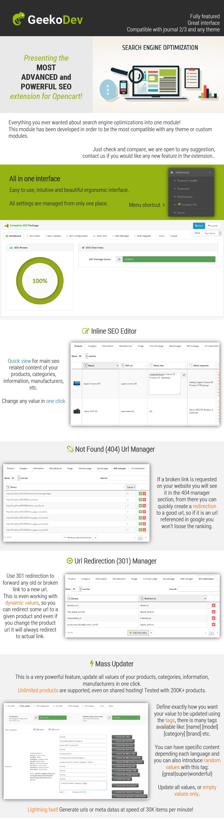 SEO 的一切都在一个模块中:易于使用、直观且符合人体工程学的美观界面。所有设置都在一个地方进行管理!轻松管理您所有的 opencart SEO 并提高您的谷歌排名。一键更改任何值,并根据每种语言提供特定内容!以每分钟 30K 项的速度生成 url 或元数据!