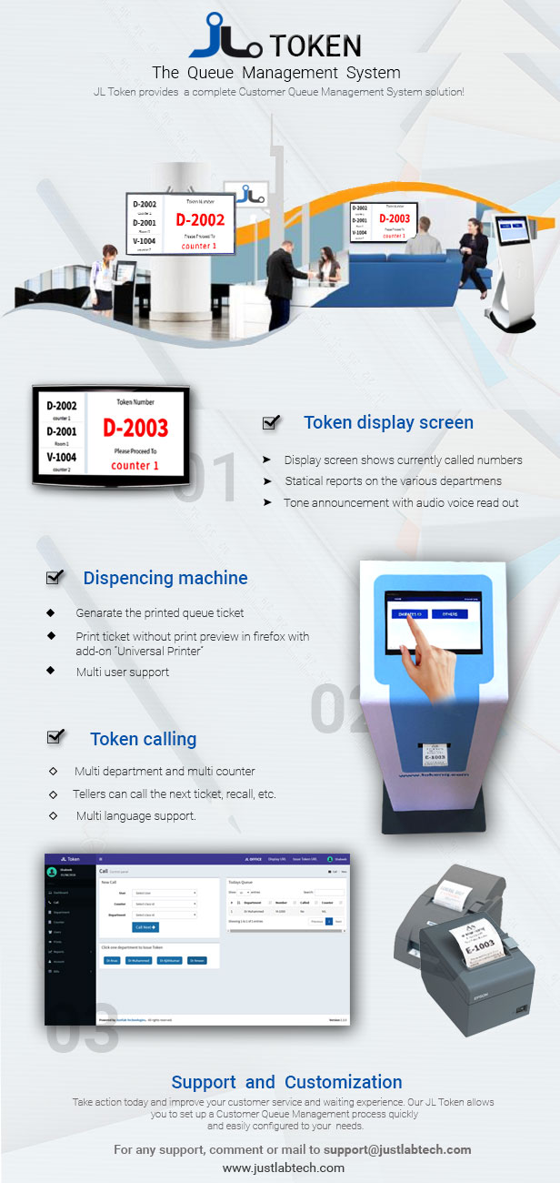 JL Token – 排队叫号管理系统,它是一个适用于在线队列管理系统。它是使用 Laravel 5 PHP 框架创建的。它可以用于打字中心、银行、医院、诊所等。