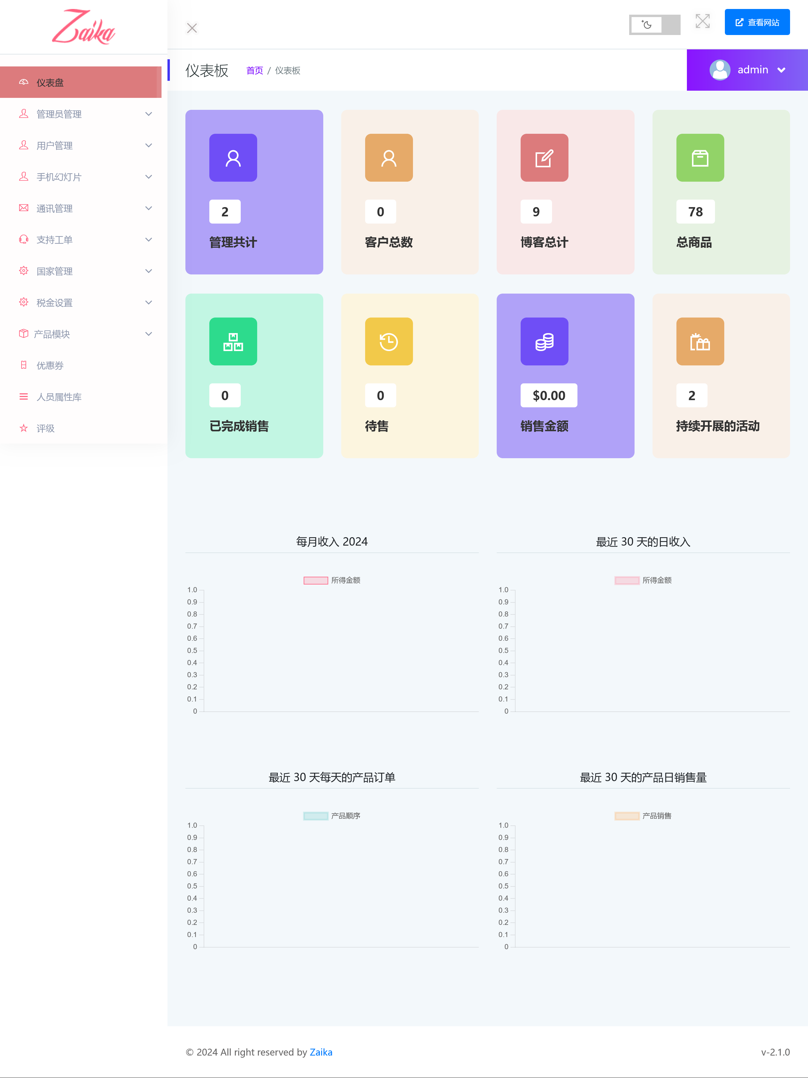 2024.01.04 更新到Zaika eCommerce CMS v2.1.0(并对程序进行了汉化,汉化方法请参照汉化包下面的安装汉化流程)