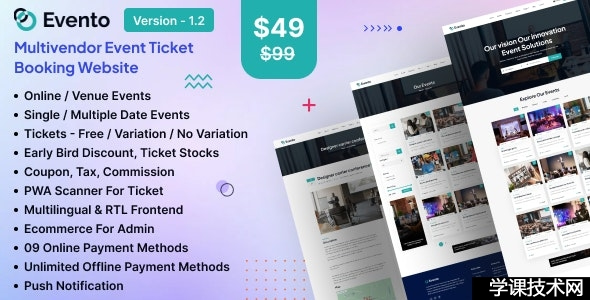 Evento 是一个庞大的多供应商活动门票预订系统。它提供了很多功能。管理员和供应商/组织者可以上传场地/在线活动。管理员可以在每次活动预订中获得佣金。Evento 提供不同类型的门票 –免费门票、明智变更门票、无股票变更门票。它还支持单个和多个日期的事件。它还提供多语言和 RTL 前端网站、单一语言的管理员/组织者仪表板翻译选项(还不是 RTL)、每张门票的早鸟折扣、税费、优惠券、PWA 门票扫描仪、管理员电子商务、报告、交易报告、每月收入报告、推送通知、添加到雅虎/谷歌日历、事件倒计时、高级事件搜索页面、拖放菜单生成器、谷歌登录、Facebook 登录、广告、广告、管理员角色权限等等……。
