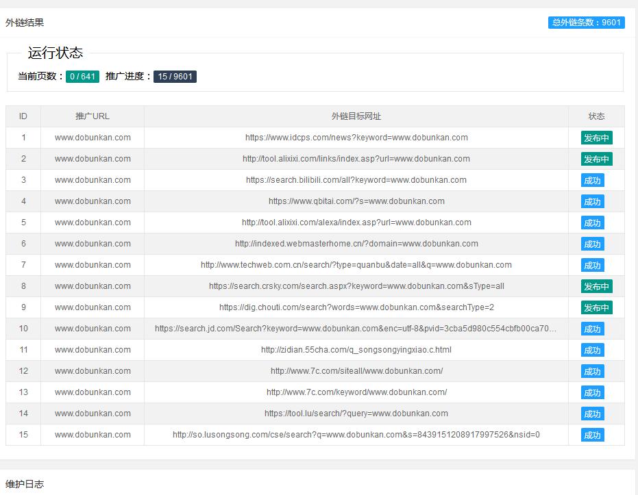 超级外链工具是一个在线为网站自动建设外链的站长工具,界面偏向清爽风格,大气简洁,还带有进度条,目前整合了9600多条外链网址,你可自行修改 urls.txt 文件对网址进行添加或删减。