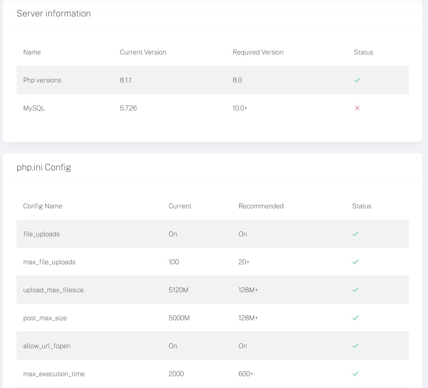 关于环境我在安装教程有提到过,apache2+php8.0+mysql5.7,但事实上他要求数据库的版本为mariadb 10.0+,在实际应用的过程中mysql5.7目前还没遇到过问题,不过,如果使用低版本的mysql的话,在后台的服务器信息里面的MySQL提示会打个红色的叉,提示数据库版本低,如果有强迫症的建议还是用高版本的数据库比较合适。